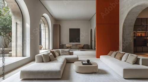 interior, design, living, room, modern, contemporary, minimalist, neutral, beige, cream, furniture, sofa, sectional, hot drink, table, arch, window, open, plan, space, light, airy, elegant, roomy, comfortable, stylish, decor, architecture, home, luxury, apartment, tone, daylight, style, furnishing