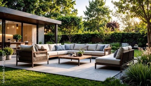 patio, furniture, modern, contemporary, pavilion, seating, wood, garden, house, living, cosy, relaxing, design, stylish, comfortable, sofa, coffee table, chair, rug, plant, tree, grass, paver, light, evening, sunlight, landscape, architecture, calm, peaceful, elegant, sophisticated, minimalist, rattan, cushion, texture, detail, ambience, quality, warm, refined, detail