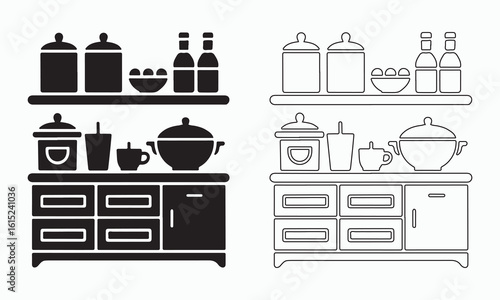 Modern Pantry Shelf Icon Set in Solid and Outline Style for Kitchen Organization