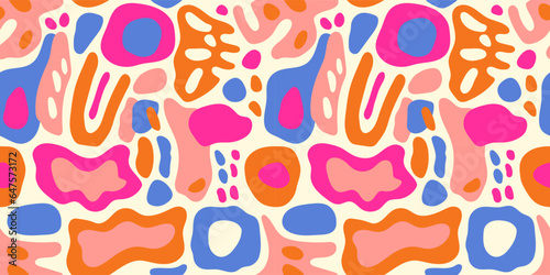 Modern playful vibrant groovy free form shapes and doodle objects seamless vector pattern. Trendy collage elements contemporary design background.