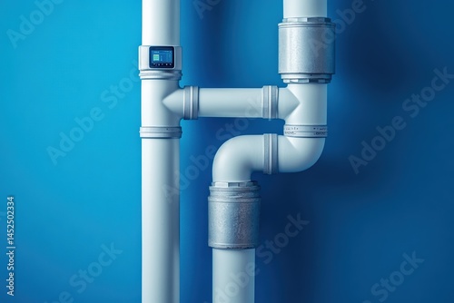 Modern plumbing system showcasing pipes and valve assembly on a vibrant blue wall
