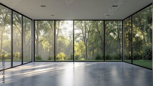 room, window, forest, tree, nature, modern, interior, design, architecture, view, glasses, sunlight, green, daylight, minimal, contemporary, empty, space, peaceful, serene, tranquil, calm, bright, landscape, wood, foliage, lush, greenery, illuminated, residential, building, home, house, habitat, environment, scene, panorama, outlook, vista