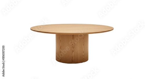 Modern round wood table with pedestal base, perfect for minimalist dining or meeting space design projects