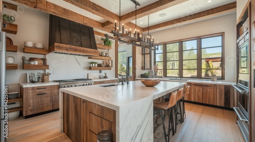 Modern rustic kitchen interior design, The room is filled with natural light and has a cozy.