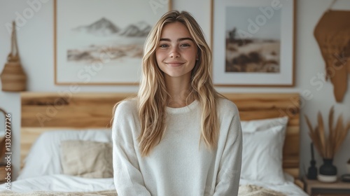 Modern Scandinavian bedroom, clean and airy, blank white canvas placed above a wooden headboard