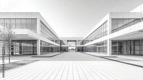 architecture, building, school, modern, design, exterior, facades, perspective, urban, city, campus, piazza, courtyard, space, light, structure, minimalist, geometric, clean, line, white, grey, contemporary, empty, empty space, view, symmetry, rendering, digital, illustration, blueprint, vignetting, study, modern architecture, building design, business building, construction