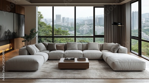 sofa, sectional, living room, city, view, interior, modern, design, home, apartment, comfortable, cosy, furniture, luxury, contemporary, beige, urban, stylish, relaxing, roomy, elegant, minimalist, room, decor, house, large, light, warm, neutral, texture, space, soft, coffee table, window, city landscape, panoramic