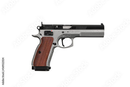 Modern semi-automatic pistol isolate on a white background. Armament for the army and police. Short-barreled weapon