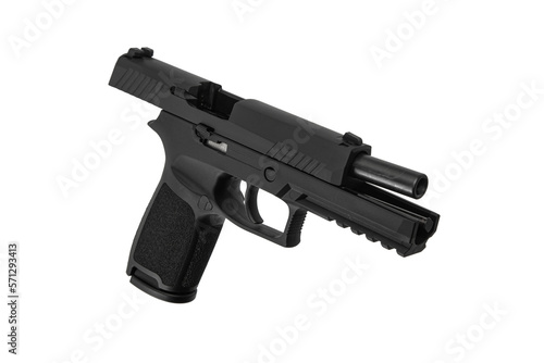 Modern semi-automatic pistol isolate on a white background. Armament for the army and police. Short-barreled weapon