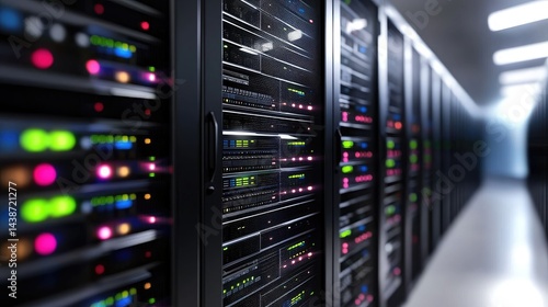 Modern server room with glowing multicolored status lights and high-tech black racks, showcasing advanced digital infrastructure ideal for cloud computing, IT, and cybersecurity