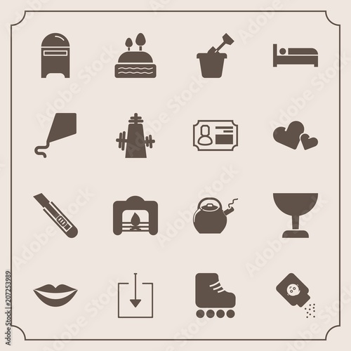 Modern, simple vector icon set with health, home, bottle, post, dessert, bed, fire, fun, doughnut, food, download, warm, lips, skating, sandbox, summer, fireplace, letter, leisure, sport, travel icons