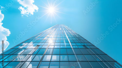 Modern Skyscraper with Sleek Glass Facade Reflecting Cityscape Under Bright Blue Sky - Contemporary Urban Architecture
