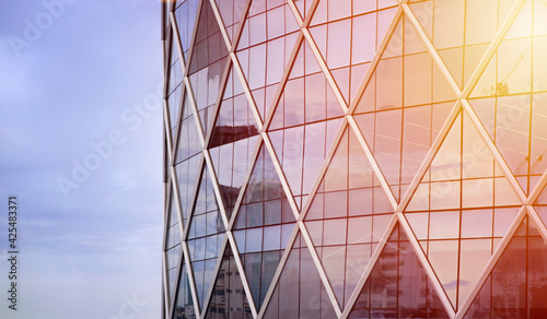 Modern skyscrapers in evening light at sunset with blue sky and lens flare filter effect, Modern building facade with reflections and colours. Glass wall, Glass building.