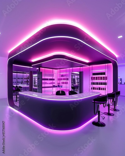 Modern, sleek salon interior with purple neon lights and curved design elements.