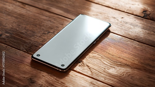 Modern smartphone with a blank display rests diagonally on a textured, wooden surface, captured in high-angle, natural lighting, exhibiting sleek lines and a reflective screen against