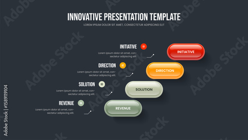 Modern Solution 4 Element Diagram Slide Template. Financial Introduction Four Step Infographic Presentation Design. Company Insight Frame Layout Vector Illustration.