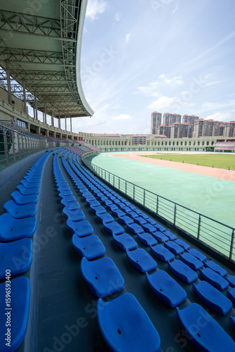 Modern Stadium with Blue Seats and Green Field Under a Clear Sky