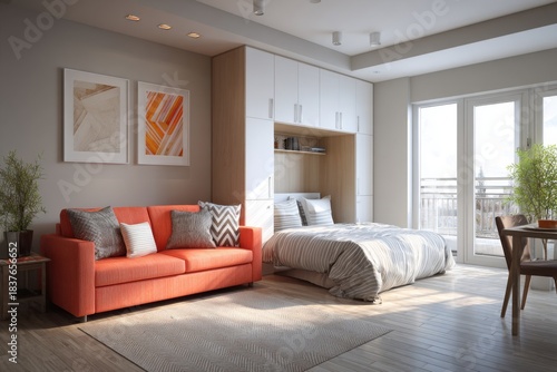 Modern studio apartment interior with orange couch and convertible bed in a bright, inviting space