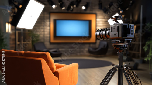 studio, camera, video, production, orange, chair, creative, space, lighting, professional, equipment, filming, setup, shoot, modern, interior, broadcast, recording, design, workspace, comfortable, seating, environment, multimedia, industry, television, film, relaxation, area, furniture, aesthetic, indoor, innovative, inspiration, planning, storytelling, media, team, collaboration, placement, sharpened, clarity, preparation, stylish, decor, casual attire, visual