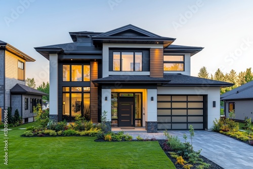 Modern Stylish Home with Well-Manicured Lawn in Evening Light
