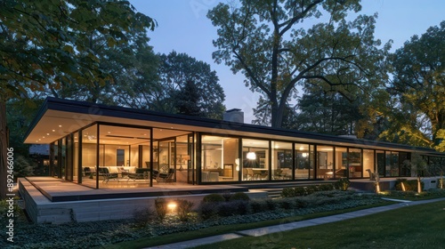 Modern suburban home featuring expansive glass walls and a flat roof, nestled among mature trees, with evening lighting highlighting its minimalist architecture