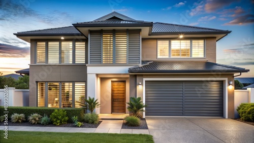Modern suburban home's exterior showcases sleek window design with contemporary shutters and tinted glass promoting energy efficiency and stylish curb appeal.