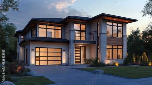 house, modern, suburban, dusk, exterior, rendering, home, architecture, real estate, property, building, design, luxury, residence, villa, contemporary, family, dream, elegant, roomy, stylish, comfortable, peaceful, evening, night, landscape, garden, driveway, garage, window, lighting, facades, wall, roof, stone, wood, brick, glasses, steel, development, construction, sale, new, for, beautiful, honed, amazing, best