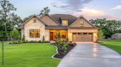 house, suburban, modern, lawn, garden, garage, evening, driveway, calmness, home, comfort, luxury, family, lifestyle, security, peaceful, architecture, real estate, rectangular, contemporary, residential, window, door, tree, grass, bush, lighting, concrete, summer, sunset, brick, siding, exterior, nature, quiet, fence, decor