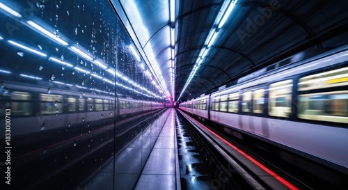 subway, tunnel, train, movement, speed, light, neon, reflecting, urban, modern, city, night, motion, perspective, metal, glasses, wet, rain, water, line, rail, transport, public, commuter, journey, infrastructure, architecture, technology, fast, dark, violet, blue, pink, blur, rapid, transit, system, moving, interior, passage, steel, city landscape