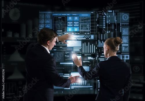 interface, panel, businesswoman, working, virtual, market, search, network, businessman, man, partner, partnership, sensor, dark, black, back, rear, touch, net, attractive, globalisation, innovation, business, presentation, cyberspace, diagram, datum, digital, report, female, technology, computer, graph, smile, connection, contact, woman, use