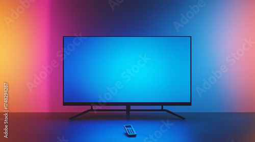 television, modern, remote control, technology, electronic, display, wall, colourful, background, gradient, blue, pink, interior, minimalist, furniture, living room, entertainment, contraption, light, flatscreen, design, simplicity, illumination, decor, media, contemporary, leisure, visual, digital, viewing, setting, copy space