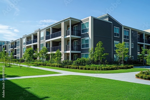 Modern three-story residential apartment buildings with balconies overlooking well-maintained green lawn and young trees under clear blue sky