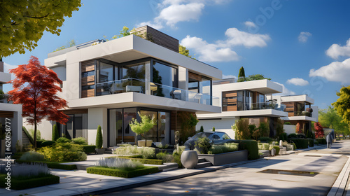 modern townhouse Linked house, two-story house, 3D, eye-level view, daytime, blue sky, white clouds Generative AI