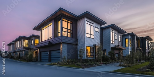 Modern townhouses, twilight, urban architecture, glass facades, warm interior lighting, contemporary design, angular structures, geometric shapes, minimalist aesthetic, landscaped vegetation, upscale