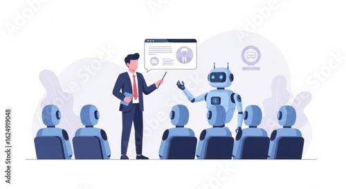 robot, automation, training, artificial, intelligence, ai, learning, presentation, classroom, teaching, technology, futuristic, modern, seminar, education, lecturer, cyborg, android, instructor, student, audience, business, innovation, development, conference, future, course, robotic, machine, concept, illustration, discussion, expert, improvement, skill, progress, upgrade, leadership, cognition, science
