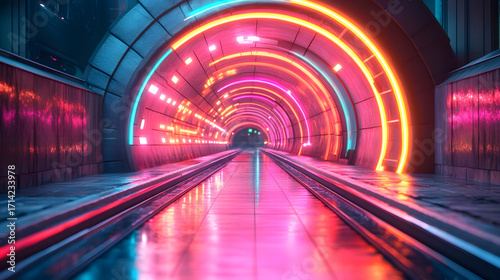 Modern tunnel interior illuminated by vibrant pink and green neon lights, creating a futuristic and dynamic atmosphere.