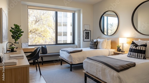 room, bed, modern, city, view, apartment, interior, design, decor, twin, living, space, contemporary, cosy, home, stylish, bedchamber, comfortable, minimalist, clean, bright, light, warm, natural, natural light, window, furniture, decoration, plant, artwork, mirror, lighting, floor, wooden, studio, minimalism, simple, neat, organised, relaxing, peaceful, guest, guest room, dorm, university, college