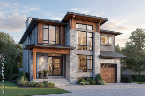 Modern two-story house exterior featuring a wooden and stone facade with large windows, set in a peaceful suburban neighborhood surrounded by manicured landscaping
