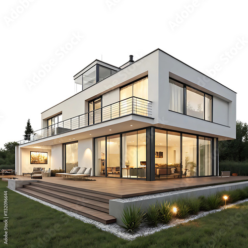 Modern Two-Story House with Large Windows and Terrace Isolated on a Transparent Background