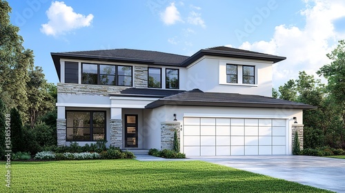 Modern two-story house with white garage door, stone accents, expansive green lawn, bright daylight, front-facing view, wide-angle shot, crisp and vibrant colors.