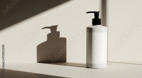Modern, unbranded pump bottle, dramatically highlighted by natural light to cast intricate shadows, creating a clean and sophisticated visual for beauty or personal care product concepts