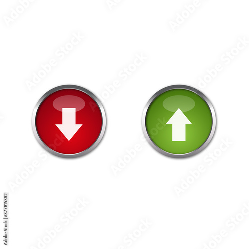 modern up & Down glossy icons, red, green set of design buttons isolated on white. Up and down Glossy Button Design set. Vector illustration