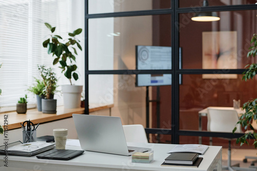 Modern urban office interior with neat white table placed against glass wall of conference room