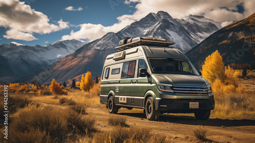 modern van, motor home on a background of mountains, road, travel, transport, car, camper, caravan, recreational vehicle, trailer, tourism, nature, beauty, wheels