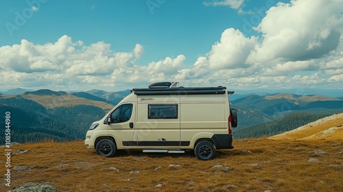 Modern van motorhome parked in the mountains, basking in the sunlight on a clear sunny day, surrounded by scenic natural landscapes, ideal for travel, adventure, and outdoor lifestyle concepts.