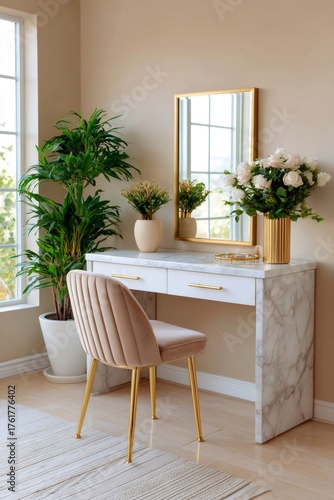 vanity, mirror, chair, modern, interior, home decor, furniture, bedchamber, elegance, luxury, style, contemporary, lifestyle, room, house, design, apartment, comfort, beauty, make up, feminine, gold, marble, velvet, beige, pink, plant, window, light, home, clean, luxurious, chic, stylish, nobody, expensive, residential, indoor, indoor, domestic, roomy, bright, sunlight, decor, aesthetic, relaxation, cosy, comfortable