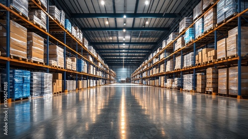 modern warehouse interior with optimized logistics , shelving systems , workers and packing stations , designed for efficient order fulfillment and inventory control , showcasing technology