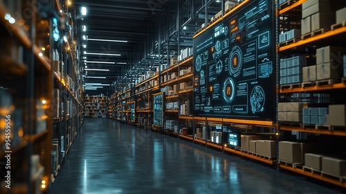 technology, abstract, design, building, packing, automation, container, datum, logistic, monitor, pallet, industrial, warehouse, receiving, futuristic, interior, shelf, carton, interface, night, light, center, storage, box, fulfillment, shipping, efficiency, modern, distribution, architecture, screen, handling, chain, dark, digital, reflections, supply, inventory
