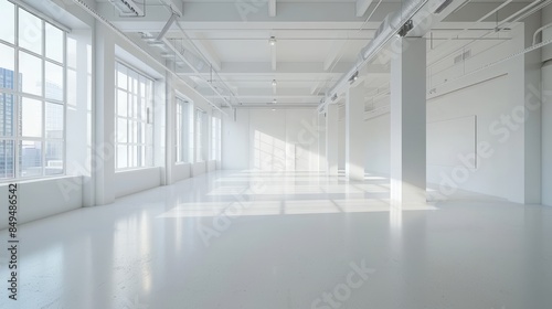 Modern white interior, empty and bright, natural light enhancing space, suitable for presentations and displays