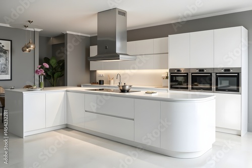 Modern white kitchen interior design with island stainless steel appliances and elegant lighting